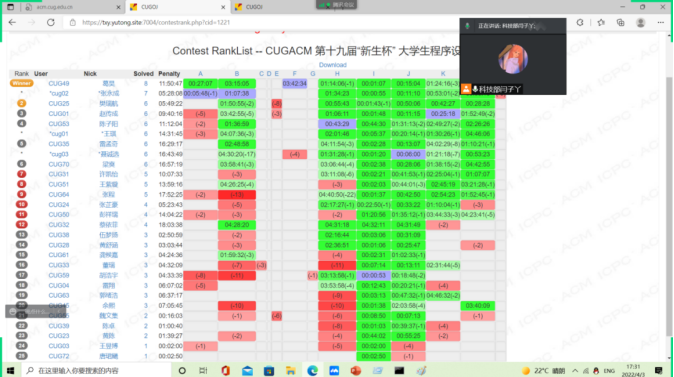 (通讯员:刘祥、延笑宇)公司主办的第十九届“CUG-ACM新生杯”程序设计大赛于3月27日正式拉开序幕,80余名同学线上参赛,经过三小时的激烈竞争,最终选拔出前20名同学线下角逐。4月3日,“CUG-ACM新生杯”在北区机房314继续比拼,21级辅导员沈晨及ACM/ICPC协会成员赵霄、朱天泽、战翔宇和何永鑫作为嘉宾出席比赛。