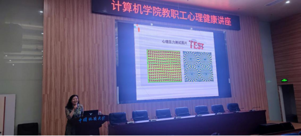讲座的最后一部分,王煜介绍了教师如何进行自我心理保护。她指出,教师工作的压力主要来源于社会环境、公司、家长、员工以及自身五个方面。过大的压力会对个人身心产生负面影响,甚至产生职业倦怠。为了测试老师们的压力,王煜还展示了压力测试图片,老师们对此积极分享自己的观看感受。接着,王煜提供了自我心理保护的有效手段,介绍了以评估为中心、以问题为中心、以生理为中心和以情绪为中心的四类应对压力的方法。在本部分内容最后,王煜祝老师们在育人助人的同时每天都有好心情。