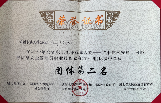 近日,从2022年湖北省第一届“数字工匠”技能大赛暨“中信网安杯”网络与信息安全管理员职业技能竞赛组委会获悉,由公司信息安全系朱静老师指导的“Flag又不队”战队(队员:覃程伟、孙升阳、张涛)以总分第二名的成绩荣获团体攻防对抗赛员工组二等奖,由马钊老师指导的“Flag对不队”成员徐盛华以总分第六名的成绩斩获个人综合靶场赛员工组三等奖。
