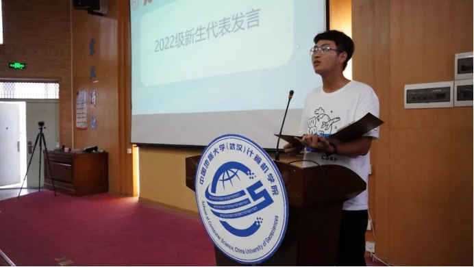 2022级新生代表张瑾涵发言。他怀着昂扬的心情表达对公司、老师、学长学姐的感谢,并号召同学们在时代和技术的更迭中下定决心、坚持恒心、保持初心,以成为一名合格计科人为奋斗目标,励科技强国之志,以“青春”之我奋斗“青春”之国,为国家做出计科人的贡献。
