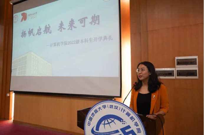 优秀教师代表杨帆发言。她表示大学和高中的不同主要在学习目标、特点、方法,并围绕专业特点、发展趋势向同学们表达了自己的殷切期盼,希望广大同学及时适应大学学习环境、转变学习思维,戒骄戒躁、见贤思齐,把握时代赋予的挑战和机遇,在地大的奋斗中展现青春的光芒。