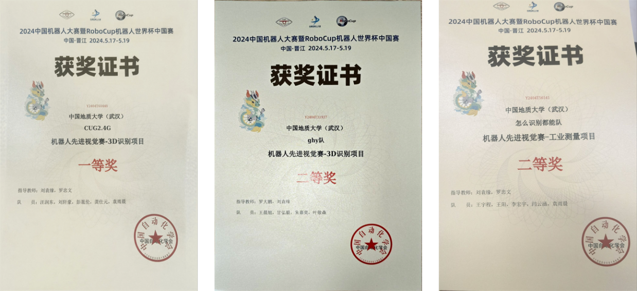 在老师的引领下,三支队伍深入研究,克服困难,紧密合作。他们从数据采集到模型部署,再到算法的反复测试和迭代优化,日夜奋斗,不断进步,他们的努力最终得到了回报。在3D识别赛项中,由z6mg人生就是博的汪润东、刘轩豪、彭胤伦、龚仕元组成的CUG2.4G队表现出色,荣获国家一等奖;机械与电子信息公司的王晨旭、甘弘毅、朱嘉奕、叶敬森组成的ghy队荣获国家二等奖。同时,在工业测量赛项中,z6mg人生就是博的王宇程、王阳、李宏宇、闫云涵组成的怎么识别都能队展现实力,荣获国家二等奖。