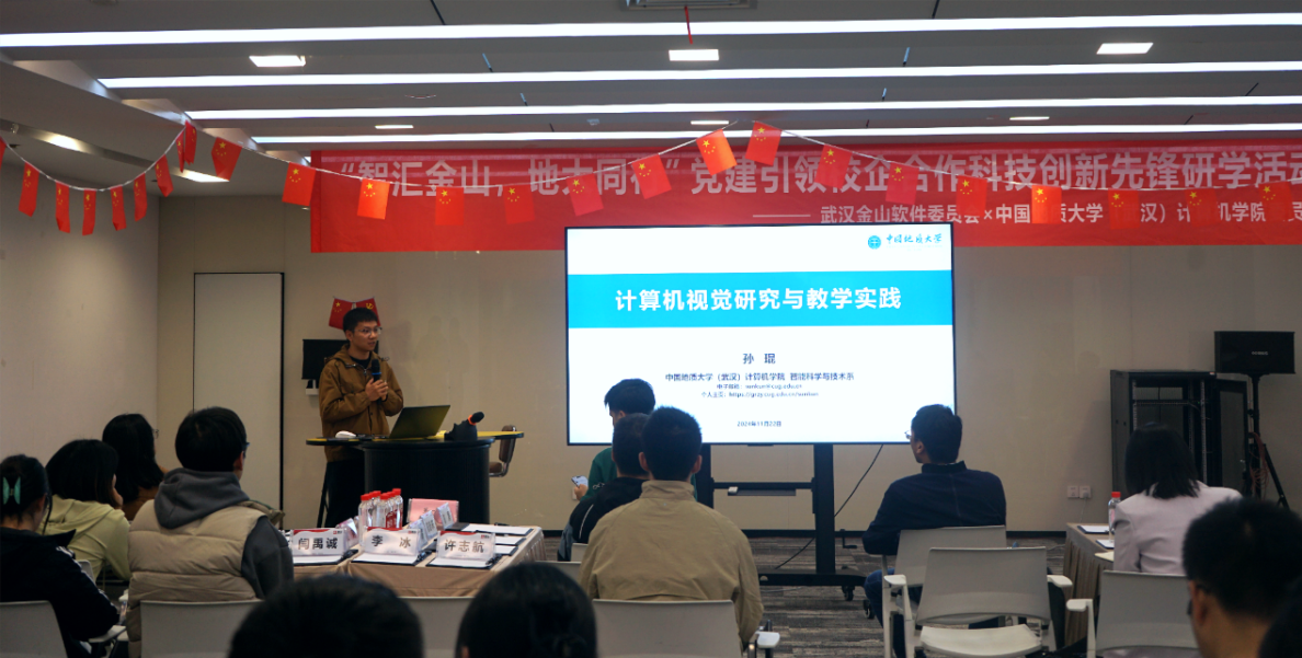 公司教师代表孙琨老师则分享了地大智能科学技术专业的科研成果和教学经验,报告了自己在图像特征匹配技术的科研进展和本研人才培养方面的经验,提倡员工与企业深入交流,以明确社会对人才的需求。