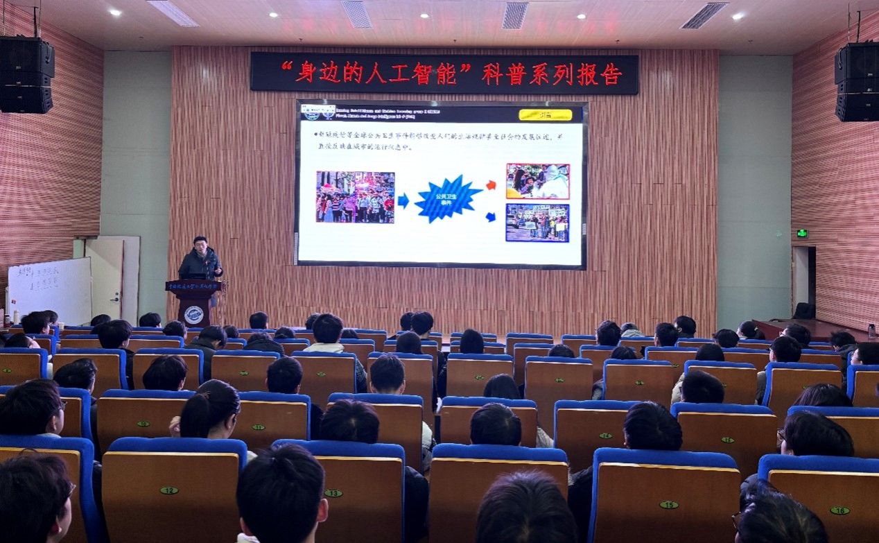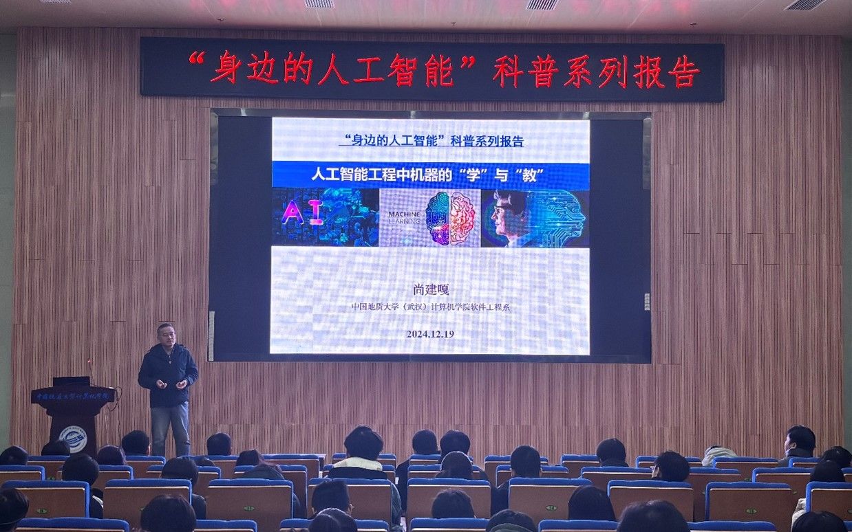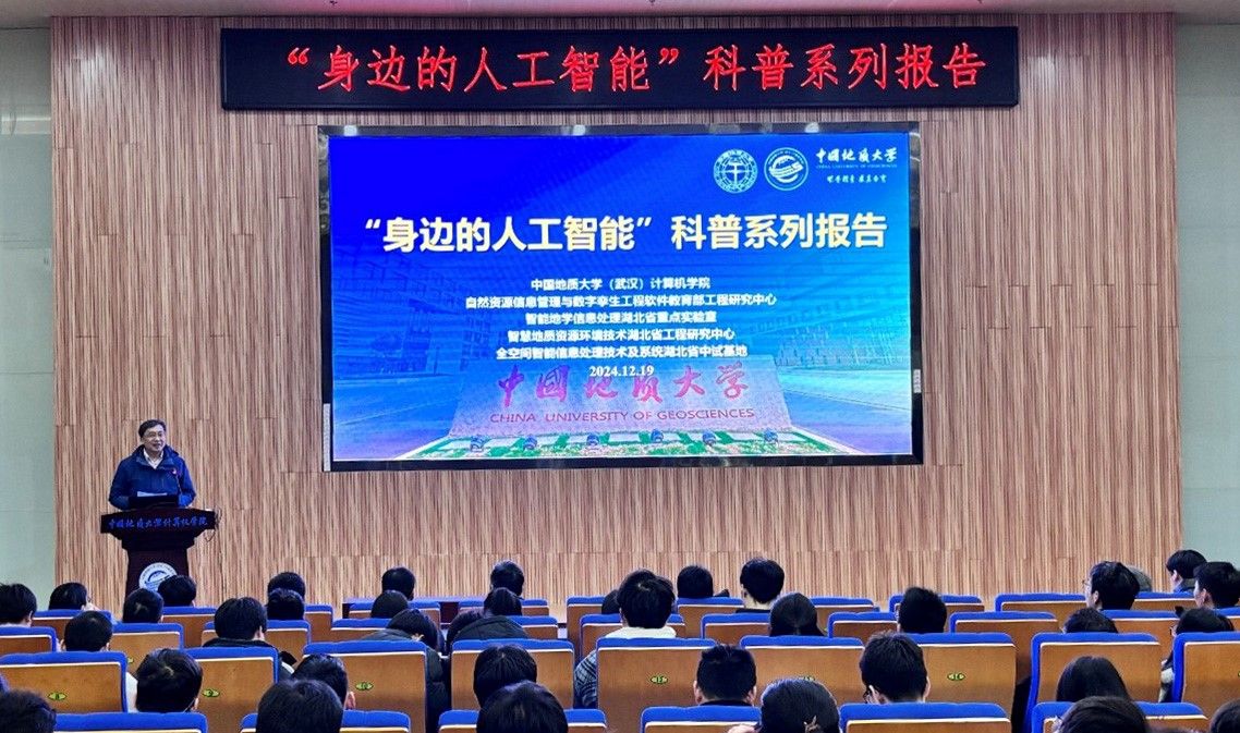 习近平总书记指出:“科技创新、科学普及是实现创新发展的两翼,要把科学普及放在与科技创新同等重要的位置”。为促进公司科学技术普及工作,弘扬科学精神,激发创新活力,12月19日下午,公司举办的“身边的人工智能”科普系列报告活动在计科楼126报告厅进行,邀请了武汉大学测绘遥感与信息工程国家重点实验室武辰教授、公司数据科学与大数据系李程俊副教授、计算机应用系陈麒玉教授、智能科学与技术系黄绍广教授、软件工程系尚建嘎教授、信息安全系朱静副教授、计算机科学与技术系甄慧翔副教授作专题科普报告,公司副经理刘刚主持活动。报告会得到了自然资源信息管理与数字孪生工程软件教育部工程研究中心、智能地学信息处理湖北省重点实验室、智慧地质资源环境技术湖北省工程研究中心、全空间智能信息处理技术及系统湖北省中试基地等科研平台的支持,也是公司建设的武汉市科普基地的活动之一。200余名师生参加了本次活动。
