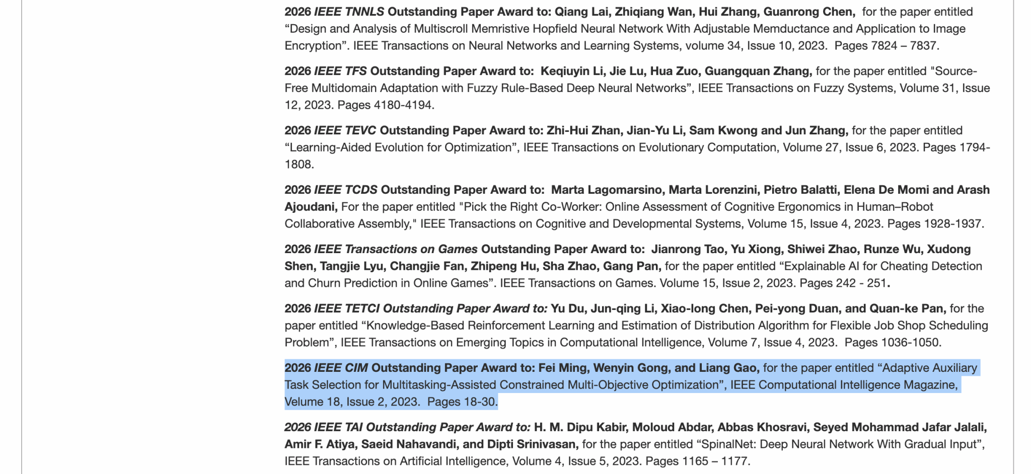该奖项旨在表彰过去三年在 CIM 上发表的最具创新性与影响力的研究工作,是计算智能领域的重要荣誉。