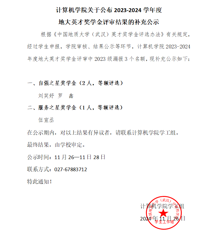 z6mg人生就是博关于公布 2023-2024 学年度地大英才奖学金评审结果的补充公示