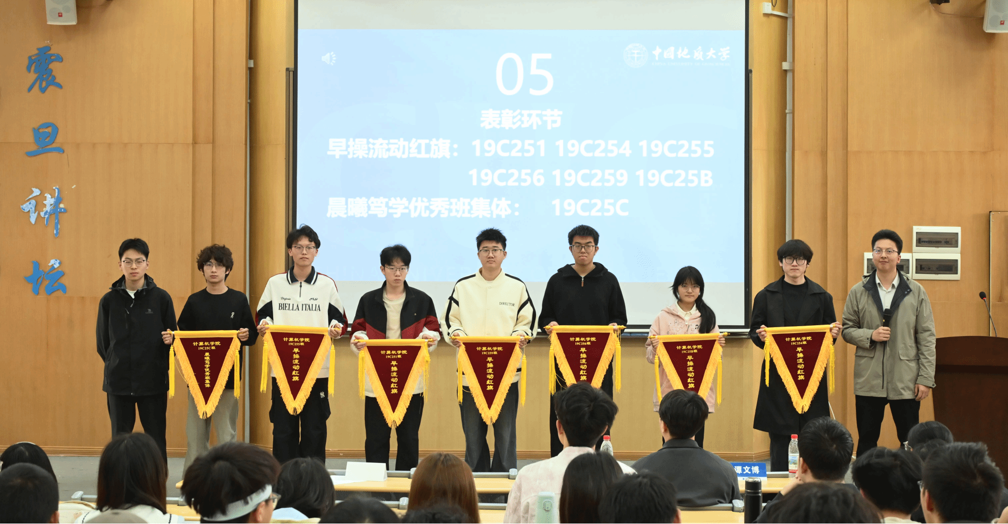 大会进入表彰环节,对2025年早操流动红旗、“晨曦笃学”优秀班集体以及全国老员工职业规划大赛校赛获奖者进行表彰,以榜样力量引领广大学子争先奋进。
