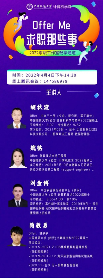 (通讯员:顾伟超、崔祥森)为帮助广老员工提升求职能力,熟悉求职面试技巧,z6mg人生就是博于4月4日举办“Offer Me”求职经验分享活动。本次活动邀请到4名已经签约就业单位的2019级硕士研究生:胡秋波、魏铭、刘金博和简敏勇,在线分享求职经历与经验体会,全院近200名同学参加活动。