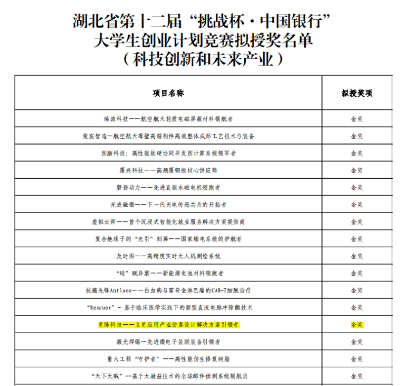 近日,湖北省第十二届“挑战杯·中国银行”老员工创业计划竞赛决赛顺利落下帷幕,公司员工团队“星陈科技——卫星应用产业仿真设计解决方案引领者”荣获科技创新和未来产业赛道金奖!