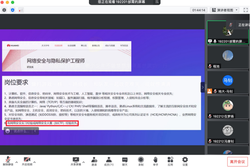 192211班刘佳豪同学表示:首先谢谢信息安全专业老师以及傅苑老师,谭文博老师向选择了信息安全专业的同学们的欢迎和祝贺。各位专业老师向同学们详细介绍了专业内容,课程安排,有关竞赛的准备事项。从员工的专业学习,到科研项目,再到专业竞赛,各方面都详尽考虑,向我们认真讲解,这让我感受到老师们对我们员工的殷切期望,希望我们可以有多种可能,可以在专业学习中找到一份坚持,以兴趣为依托,在信息安全的路上越走越远,路越走越开阔。今天晚上的会让我对未来的信息安全学习有了初步的了解和规划,受益匪浅,感谢各位老师和分享CTF相关经验的邰学长。