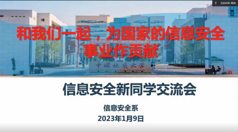 信息安全系系主任程池老师带来信息安全系的专业介绍,与同学们分享如何参与科研实践活动的方式与经验,展示了2023届的优秀员工的发展路径,代表信安系全体老师欢迎同学们与各位老师沟通交流,一起为国家的信息安全事业努力。希望大家在接下来的学习中,既要学好专业知识,同时也体会奋斗的喜悦;功不唐捐,即使失败也是非常宝贵的经历。