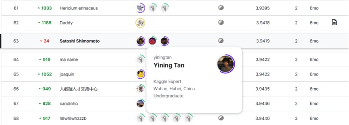 五场比赛历时3个月,分别吸引了来自全球多个国家的494支队伍,954支队伍,3547支队伍,1805支队伍和1033支队伍报名参加。经过激烈的角逐,来自公司的李桢宁同学在两场比赛中分别获得了铜牌(前19%)和银牌(前5%),SatoshiShimomoto队伍在三场比赛中分别获得了三枚银牌(Top2%,Top4%,Top5%)。
