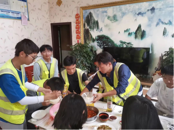 中午,同学们在老乡家里吃上了一碗热腾腾的西红柿鸡蛋面,以缓解半天的炎热和疲劳。用完餐后,大家继续整装出发,一路向北。