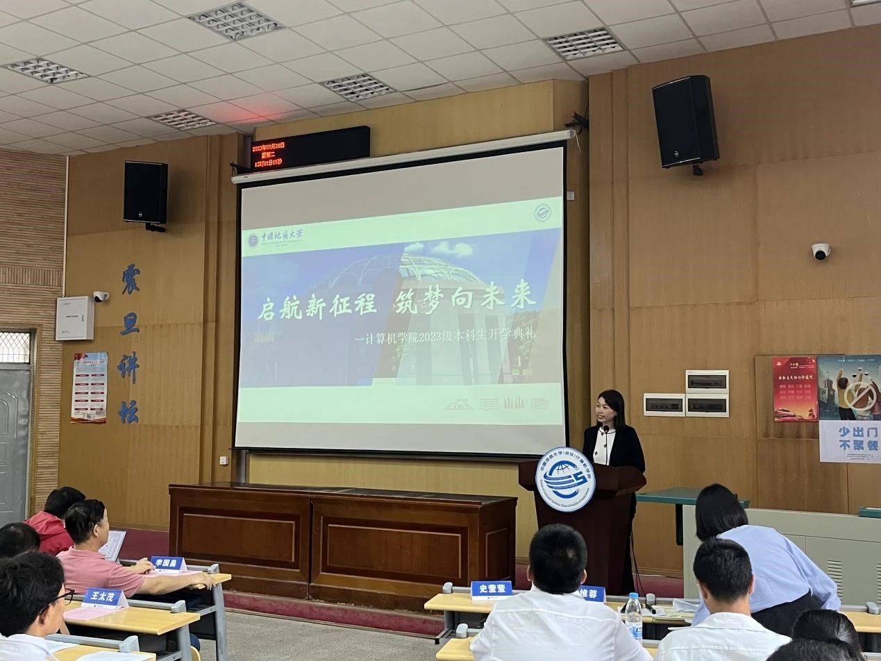 计算机公司党委副书记、经理张洪艳致辞。张经理首先代表全院师生对加入z6mg人生就是博的382位本科新生表示热烈的欢迎与衷心的祝贺,他对同学们选择加入计算机大家庭,成为“地大计科人”感到分外欣慰。他希望同学们在未来几年中为自己的选择砥砺耕耘、拔节生长、向阳而生,在地大、在z6mg人生就是博留下一生中最为深刻的年轮。同时,他向全体新生提出三点建议:一是要选择肩负使命,心怀国之大者。计科学子要深耕科研土壤,为国家掌握关键性核心技术贡献力量,让青春在实现民族使命中闪耀;二是要选择仰望天空,永攀知识高峰。计科学子要保持对知识的渴望,努力成长为具备计算思维、引领行业发展的交叉学科人才,用广阔的学科视野面对新的挑战;三是选择脚踏实地,练就过硬本领。计科学子要时刻与电脑和网络打交道,在电脑与网络间要学会拒绝诱惑,将时间用在了解行业发展最新前沿,了解市场需求驱动关键技术的突破。