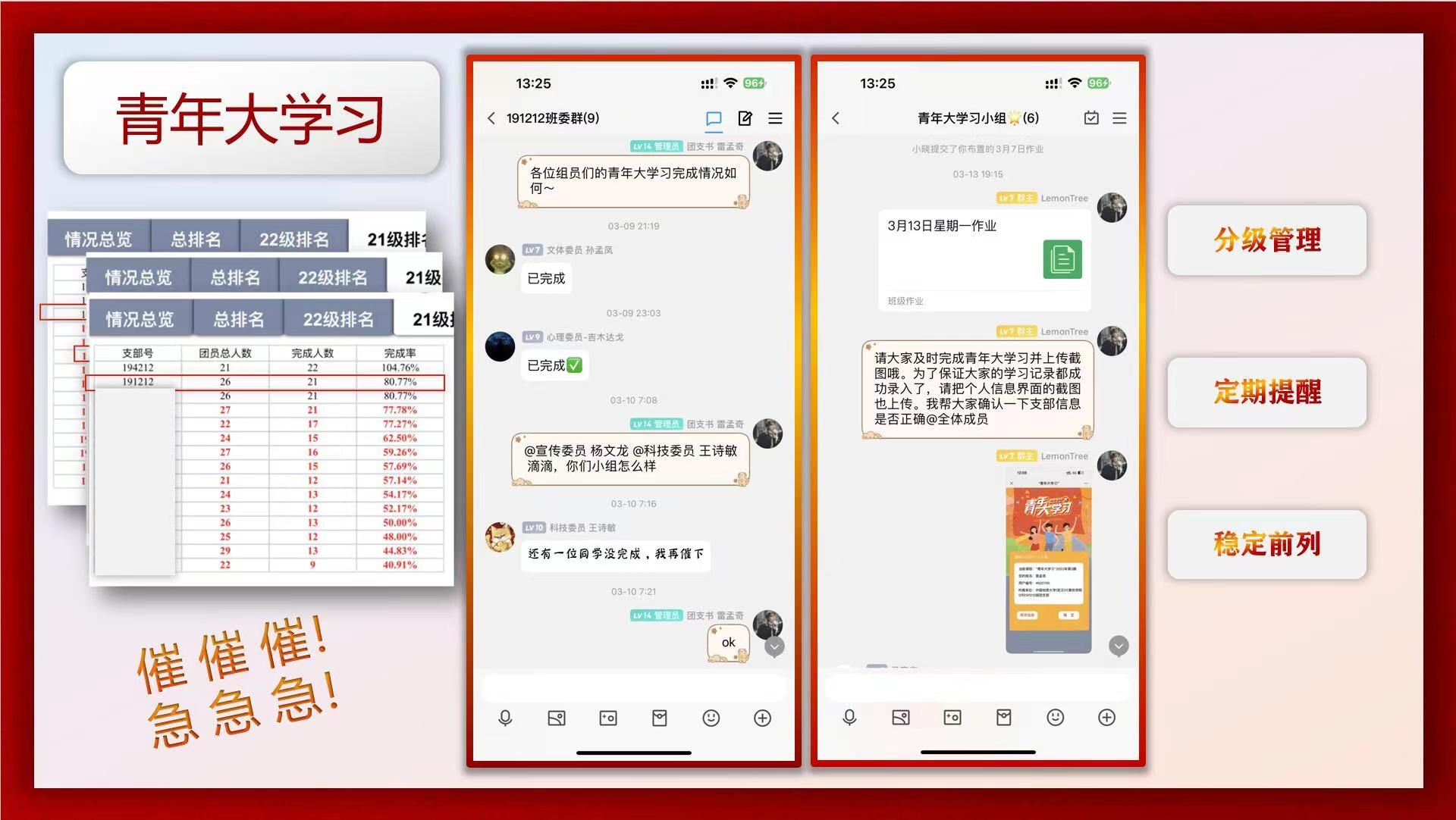 中国共产党和中国共青团的鲜艳红色是191212班积极进取的青春底色。在青年大学习中,191212班采用分组学习的方式,始终把红色思想的弘扬落实到底。从团支书、到组长、到组员环环监督,191212班总是把学习率锁定在公司前列。在入党推优中,191212班秉持公平公正公开的原则,严格审批把关,激励每一位同学早日入党。191212班已有14位同学参与入党推优,3位预备党员。在2023年的五四评优中,191212班以第一名取得了校级五四红旗团支部的荣誉称号。