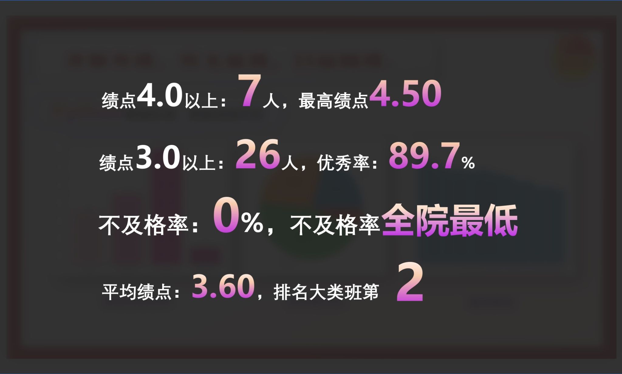 191212班大二春季学期绩点4.0以上7人,绩点3.0以上26人,最高绩点4.5;平均学分绩点排名公司大类班第二;挂科率为零,位列公司第一。