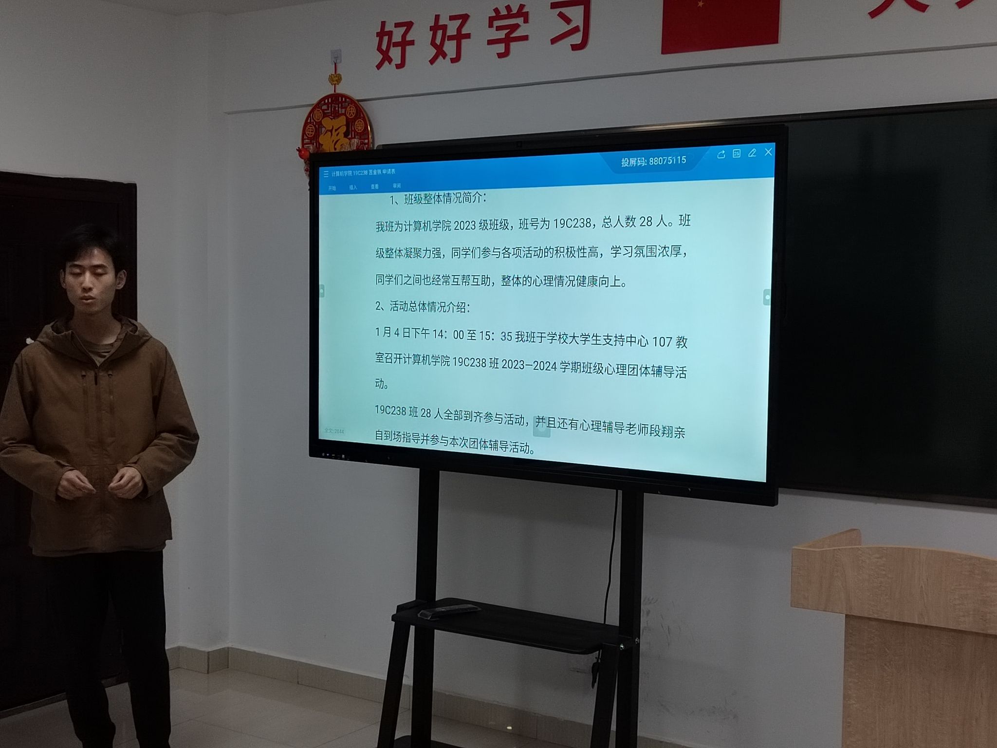 随后,由三位在2023年秋季学期“成长与发展”主题班会中获得校级一等奖的心理委员分享经验。19C23C班心理委员吴汉东、19C238班心理委员苦金铁分享班会组织经验和材料收集经验,提出心理班会应做到以人为本,设身处地站在同学角度思考问题方能真正解决问题。19C239班心理委员陶方阳则分享了心理班会示范课体验与班会组织经验,讲述了心理委员如何让班级成员放下手机,真正融入集体活动,并从中受益。