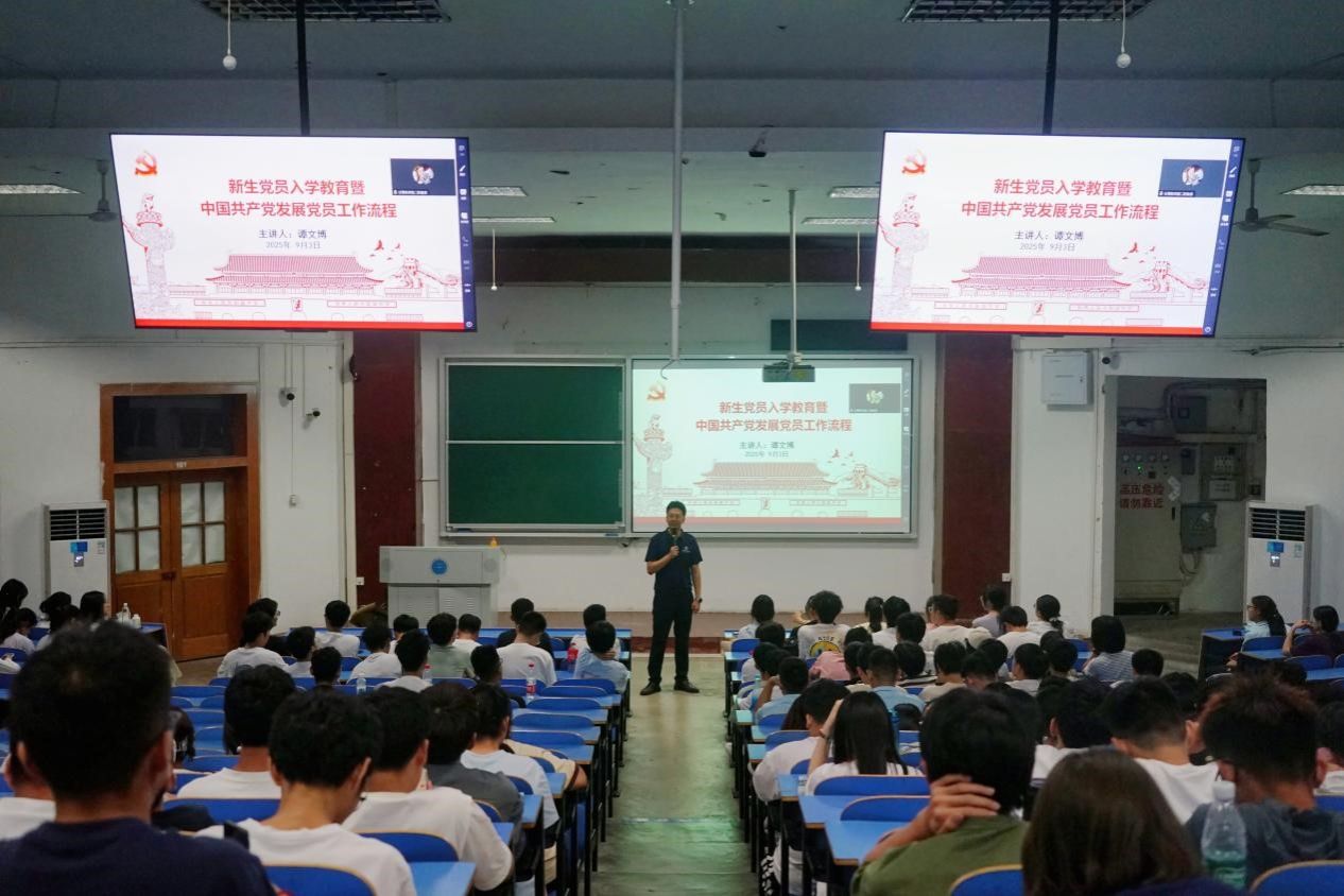 辅导员谭文博围绕“认识中国共产党、发展党员工作流程、公司党建办公室职能”三大核心展开入党教育。他介绍从“申请入党”到“党员转正”的五步发展流程,明确入党相关细节;同时介绍公司党建办公室架构,分享历届党建办成员成长案例,为新生明晰发展方向。