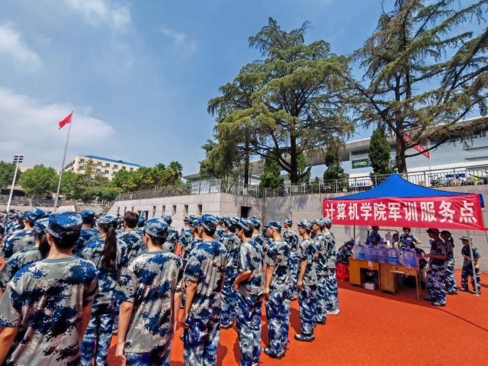 训练场上,学子顶烈日站军姿、冒雨水踢正步,在打靶训练中专注投入,于消防演练中冷静操作,在升旗仪式中肃立致敬;军训服务点精准调度物资、及时传递关怀,织就后勤保障网。