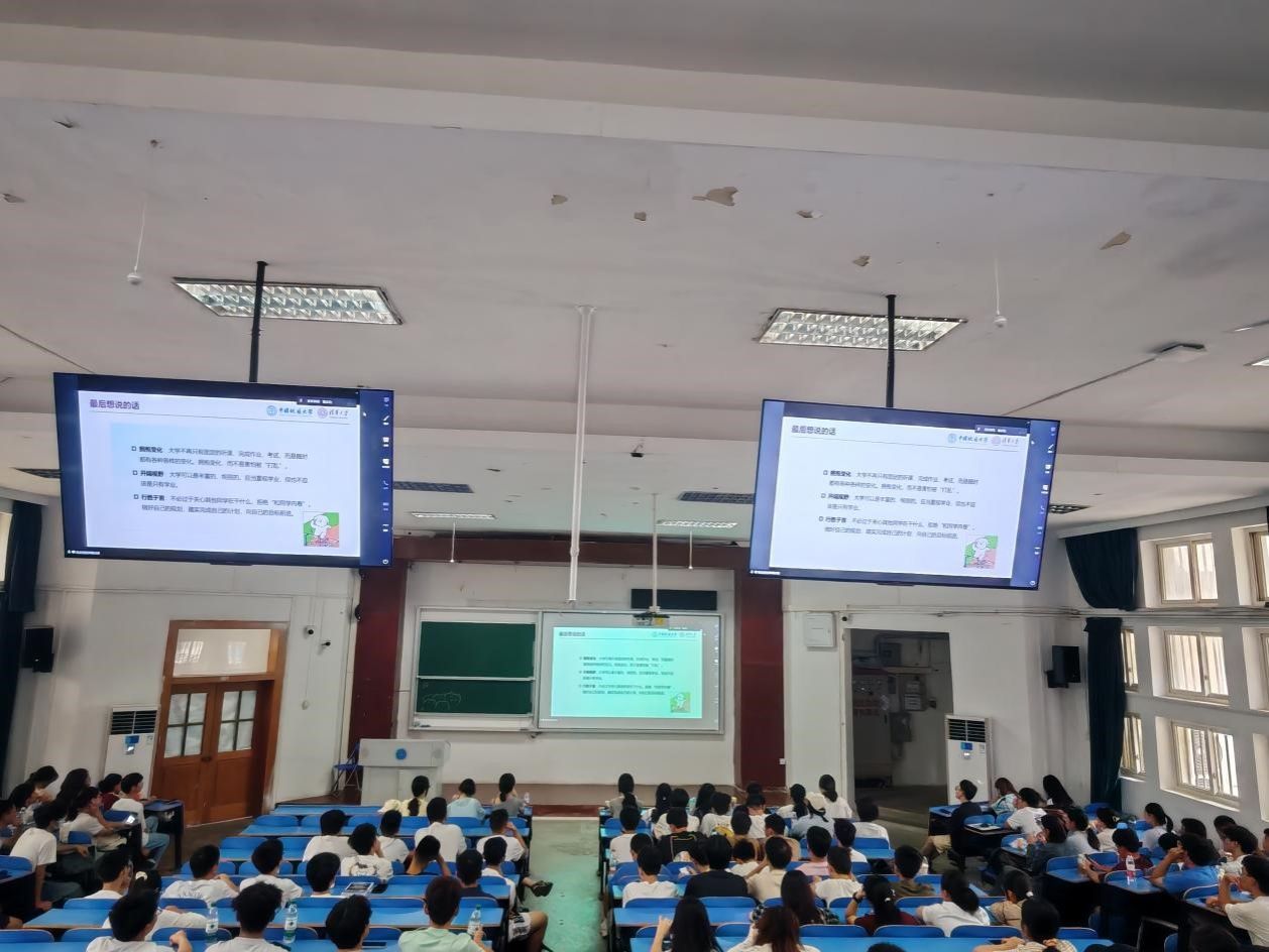 辅导员谭文博开展新生入学教育,重点讲解大学日常管理要点,助力新生快速了解大学规则、适应新环境。