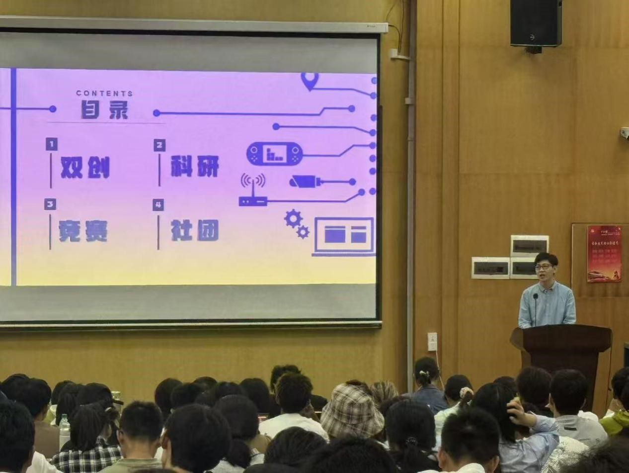 随后,科技部副部长胡家维同学围绕双创、科研、竞赛与社团活动四个维度,为在场同学带来详实的内容分享。他详细阐述了“双创”活动的相关内涵以及其对未来发展的潜在意义,并鼓励大一新生将科技论文报告会作为开启大学科研实践的第一站,引导他们积极参与到科技活动中去。此外,他还介绍了公司支持的多项科技竞赛,包括ACM程序设计竞赛、CTF网络攻防比赛等,并指出这些平台不仅为团队协作和自我展示提供了宝贵机会,还能锻炼同学们的实践能力与创新思维。最后,胡家维同学向大家介绍了ACM协会、网安协会、智能基座协会等科技类社团,鼓励新生在专注学业的同时,踊跃参与课外实践,实现学术交流、技能拓展与兴趣培养的全方面发展。