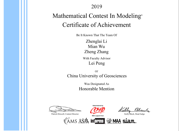 公司研究生在2019年1月25日至29日为期四天的比赛时间中,沉着冷静,细心求证,就指定的问题顺利完成从建立模型、求解、验证到论文撰写的全部工作,获得Honorable Mention奖(二等奖)。