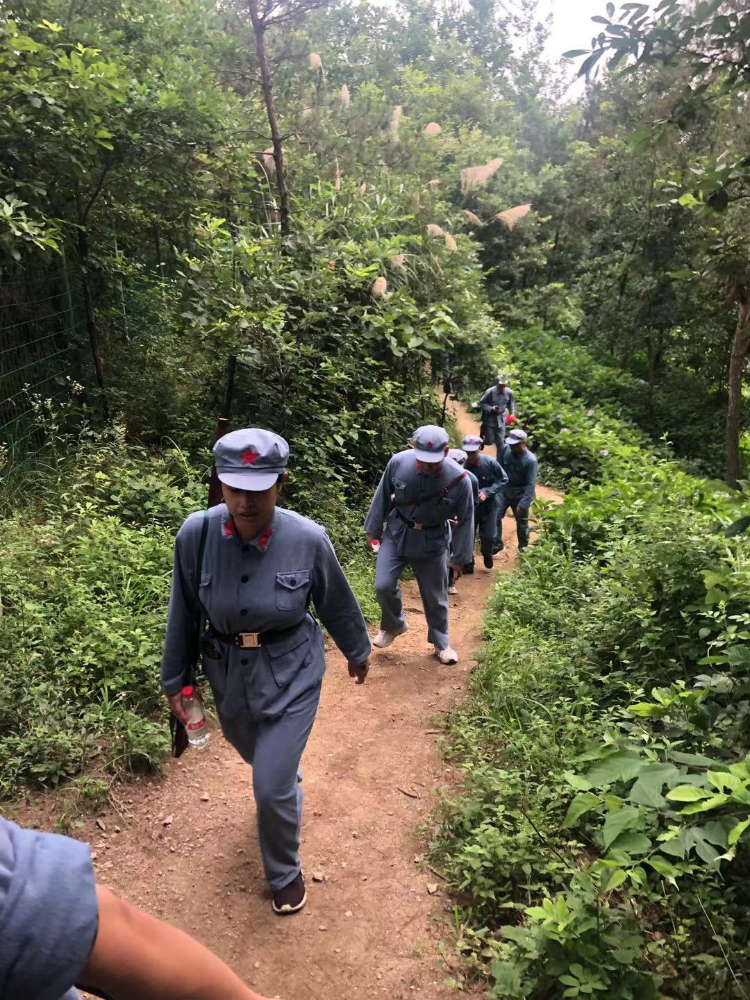 首先,党员们举行了开班仪式,李向和董礼君分别任一班和二班的班长,李程俊任旗手。大家穿好军装、记上皮带,带上装备。排着整齐的队伍开始了长达两小时的重走长征路的体验活动。