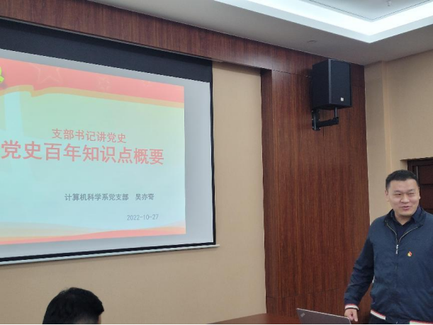 计算机科学系吴亦奇同志以“党史百年知识点概要为题,分党史阶段、党史人物、党史会议、党的建设四个部分,分享了学习党史的体会。
