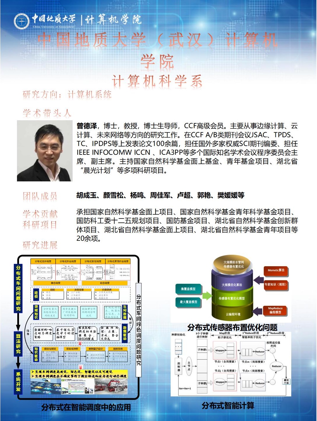 主要从事并行分布式计算、新型计算机、计算机网络与通信、嵌入式系统、信息存储、可信计算与容错计算等方面的科研工作。针对大规模给水管网传感器分布式布置优化模型进行研究,建立能监测节点全部污染事件的最少传感器数目及最优布局的优化模型;研究分布式框架下大规模优化算法,利用专家知识规则对算法的个体局部搜索进行引导,从而使算法具有更快的收敛速度和求解精度。共有专任教师9人,其中学术带头人1人,学术骨干3人;承担国家自然科学基金面上项目、国家自然科学基金青年科学基金项目、国防科工委十二五规划项目、国防基金项目、湖北省自然科学基金创新群体项目、湖北省自然科学基金面上项目、湖北省自然科学基金青年项目等20余项。在国内外专业期刊发表论文100余篇,国家发明专利和软件著作权20项。