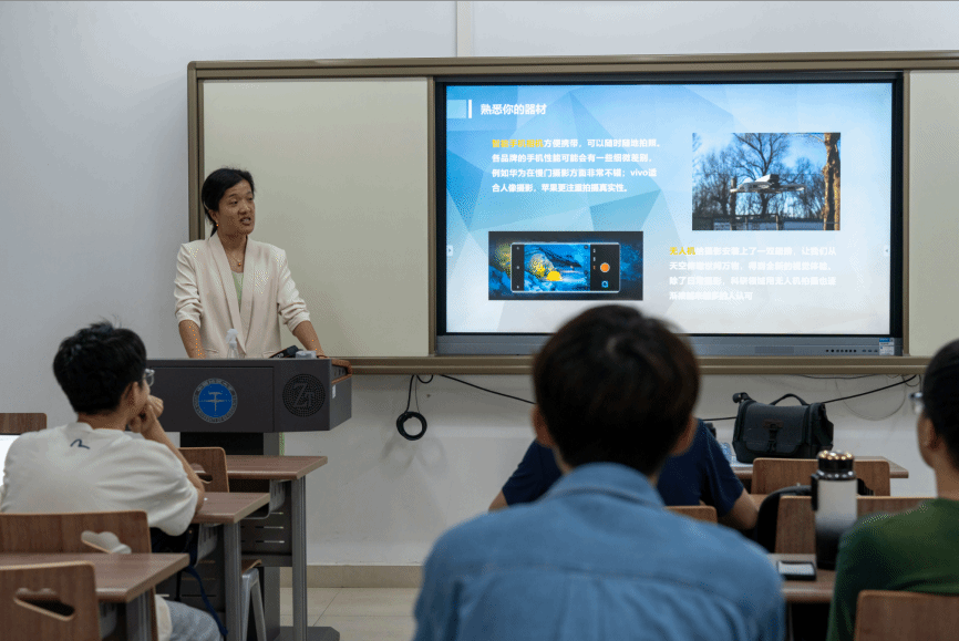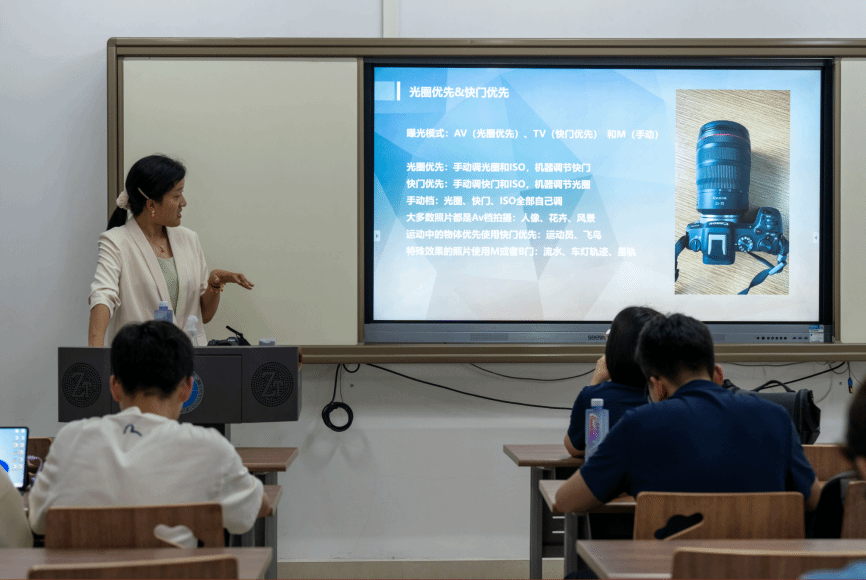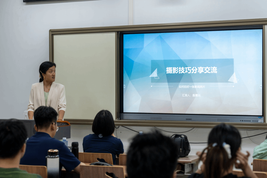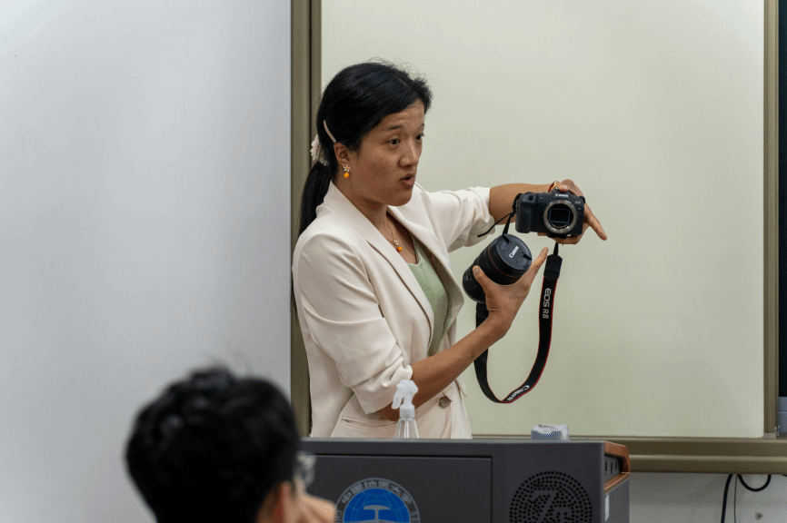 殷老师指出,视不同情况调整相机、不断调整数码相机参数是拍出符合氛围格调的优秀新闻照片的必要步骤。她提到了控制景深和进光量的光圈;影响感光元件感应光线多少的慢、高速快门;作为灵敏度调节器的“感光度”以及相机的焦段。此外,她还详细为在场成员区分了光圈优先与快门优先的区别。她从相机参数触发,解释它们影响照片质量的各种角度,不断为大家探讨与科普照出不同风格和效果的路径,使在场同学受益良多。