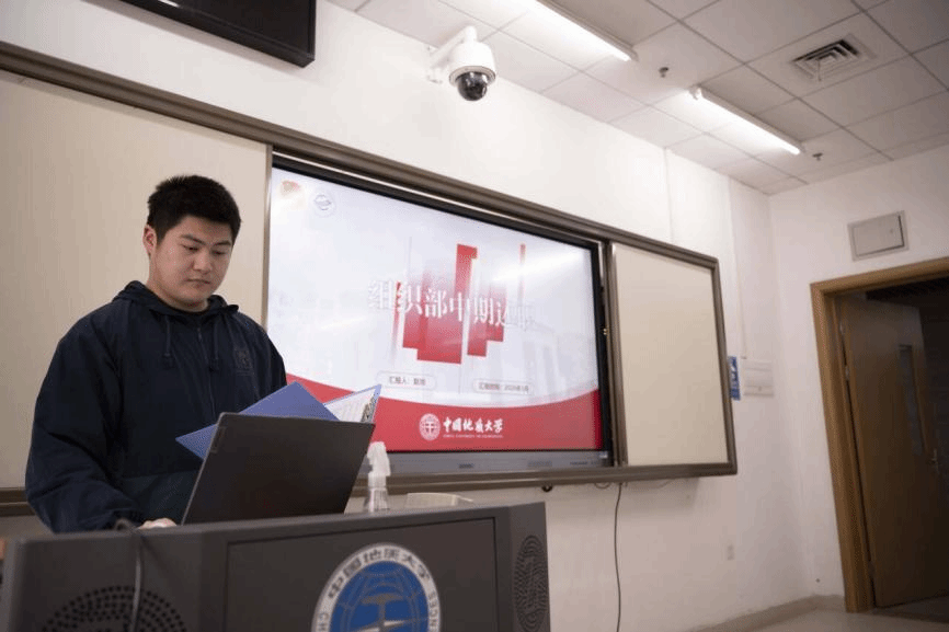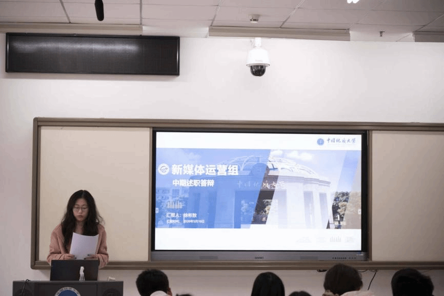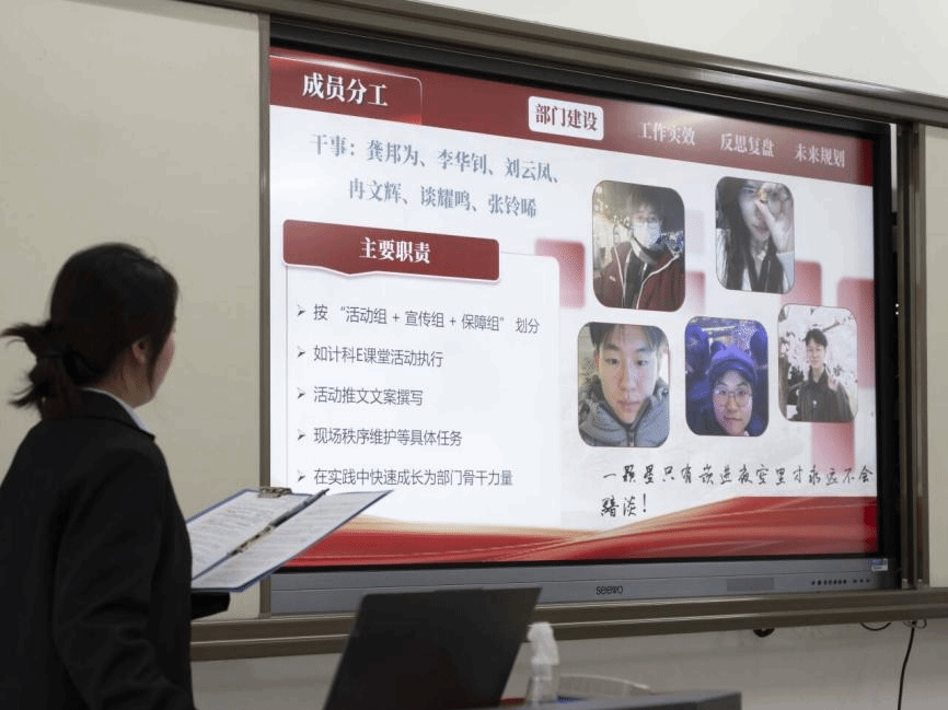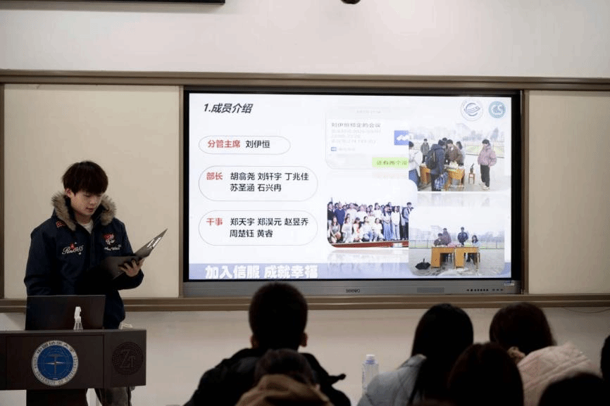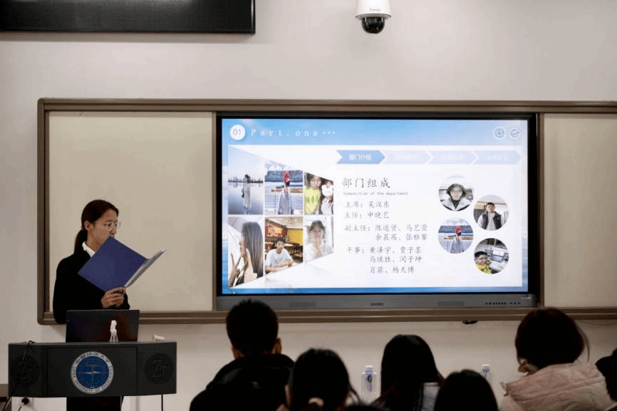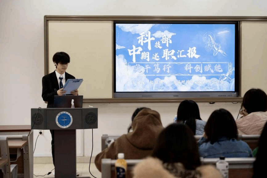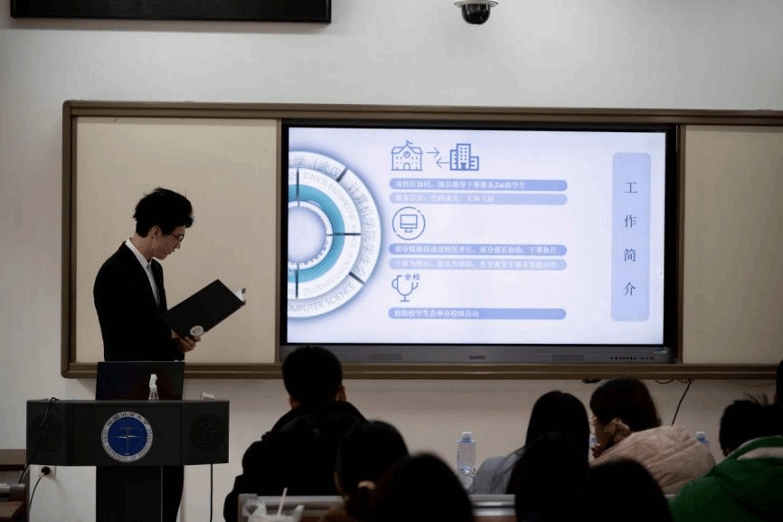 答辩现场,由员工会主席团成员吴汉东主持,组织部、志愿者协会、全媒体中心各工作组、信息调研与权益服务中心、文体部、办公室、科技部、学风部各部门负责人进行依次汇报。