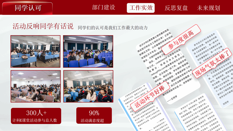 学风部深耕学风建设与青年成长,打造“新生入学指南”“计科E课堂”“保研分享会”“宿舍文化节”等特色活动,其中“计科E课堂”参与人数突破300人,活动满意度超90%。通过榜样引领、经验分享,引导学子树立优良学风、明确成长方向。