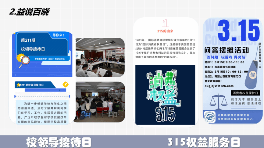 信息调研与权益服务中心立足学子需求,统筹员工信息调研与权益保障,设立双渠道权益信箱、打造“益呼百应”、“益说百晓”、“益吐为快”等特色栏目,组织信调大赛、315 维权日等活动,及时回应学子诉求、传递同学心声。