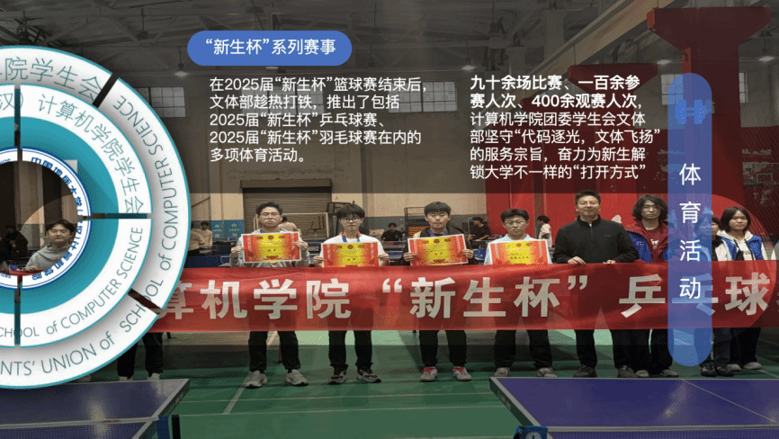 文体部以丰富学子课余生活为核心,扎实开展早操查操、文体通知推送等基础工作,成功举办新生杯系列赛事、迎新晚会、春日主题活动等特色活动,联动各球队做好训练与赛事保障,全力营造积极向上的校园文体氛围。