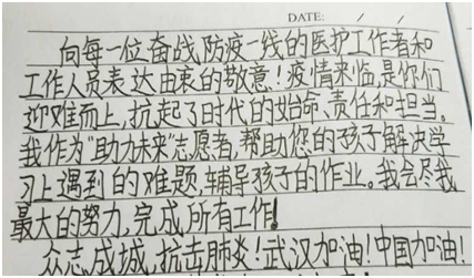 身处抗疫一线的医护人员为武汉人民乃至全国人民服务,而我们希望可以为这些最可敬的人们服务,相信这是所有参与此次志愿活动的同学的心声。医者仁心,他们在关键时刻挺身而出,肩负起全国人民的生命健康,是他们让所有人看到胜利的曙光在不远处向我们招手,是他们给予我们必胜的信心。我们这些志愿者虽不能在抗疫一线服务,但我们可以为这些平凡英雄的子女们提供服务。辅导他们完成作业、解疑答惑,教会他们一些新知识来拓展视野,抚慰他们的心灵。希望我们每一位志愿者的微薄之力能够让每一个医护人员不再担心,我想,这便是我们这次志愿活动的初心与使命吧!