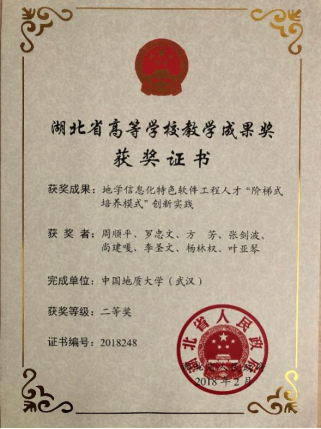 系党支部支持与积极参与探索软件专业人才实践模式创新,本专业整体执教水平明显提高,涌现一批优秀教师。。由本专业团队申请的“地学信息化特色软件工程人才阶梯式培养模式创新实践” 2018年获第八届湖北省高等公司教学成果奖二等奖。参与的“地理信息类专业应用型人才培养3332教学体系的构建与实践” 2018年获国家级教学成果二等奖。通过教师团队的打磨罗忠文老师2013年获评校级教学名师;张建波等三位老师先后获得金石奖教金;2018年张德军老师获校青年讲课比赛一等奖;2015年赵一石等老师获“最受员工欢迎老师”称号;2018年叶亚琴老师获得“最受员工欢迎课程奖”称号。方芳等六位老师获多次公司教学质量评价优秀奖,获奖人次在全校表现突出,本专业整体呈现精心教学的良好风气。