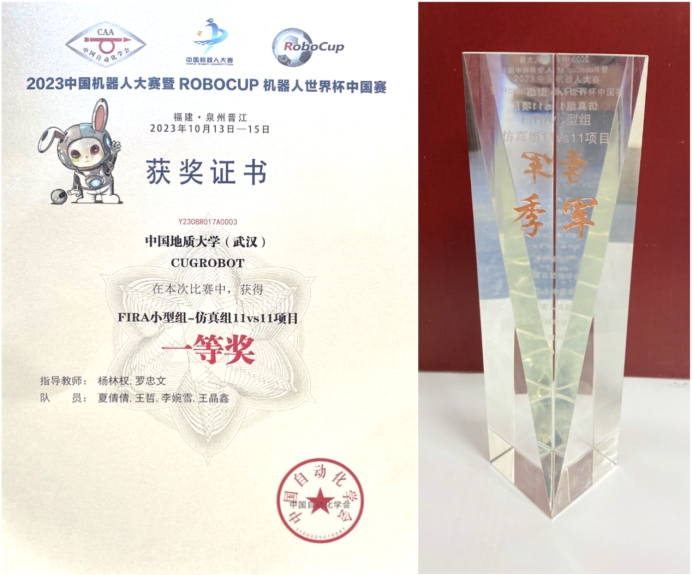 2023年中国机器人大赛暨RoboCup机器人世界杯中国赛(以下简称:中国机器人大赛)落下帷幕,公司CUGROBOT代表队参加。经过激烈角逐,杨林权、罗忠文两位老师带领研究生张翡、夏倩倩和本科生朱子恒、王哲、曾馨、李婉雪、王晶鑫获得FIRA仿真组5vs5项目季军、一等奖,FIRA仿真组11vs11项目季军、一等奖。比赛过程历历在目,记忆犹新。
