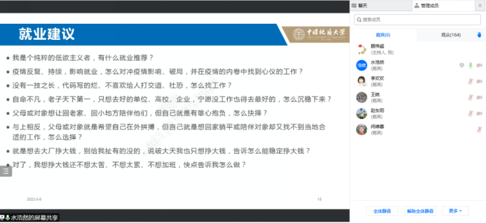 三位员工嘉宾全方位细致地分享他们曾经的职业选择、求职规划与当下的职场感受,从多个维度给出有关求职就业的经验与建议,并且耐心细致地回答与会人员的提问。不少同学表示颇有收获、受益匪浅。