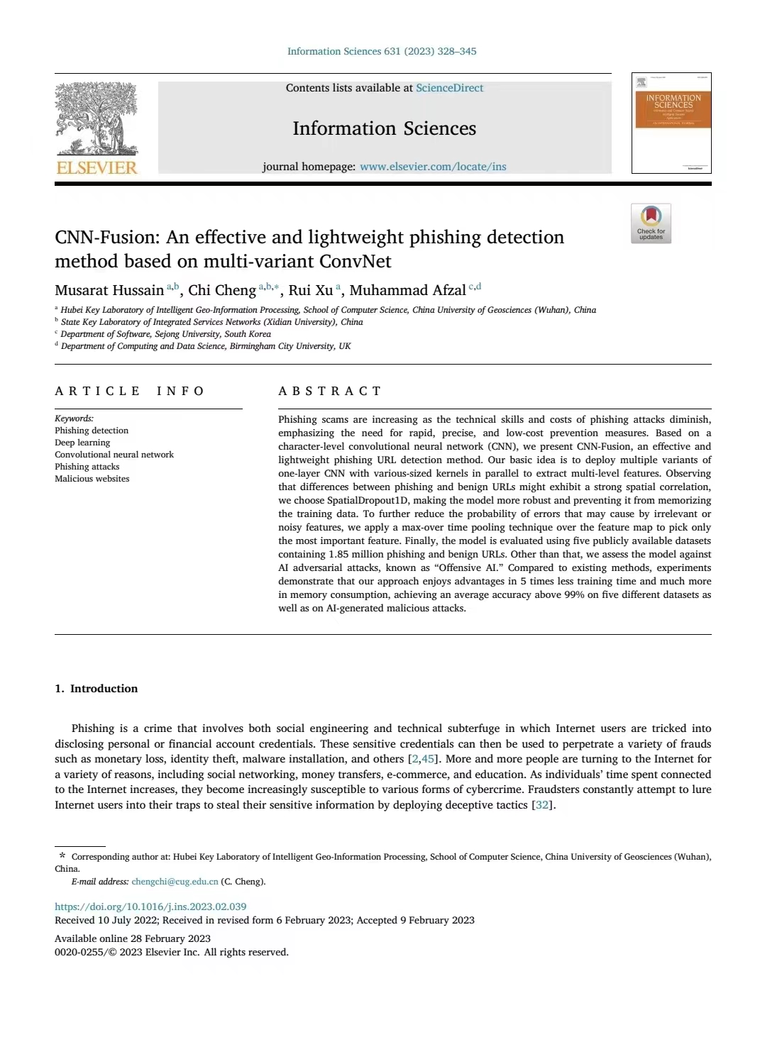 近日,公司z6mg人生就是博程池老师团队与英国伯明翰城市大学计算Muhammad Afzal教授在国际知名期刊《Information Sciences》(T1, IF=8.233)上共同发表学术论文《CNN-Fusion: "CNN-Fusion: An Effective and Lightweight Phishing Detection Method Based on Multi-Variant ConvNet"》。论文的第一作者Musarat Hussain(中文名:胡文硕)是公司2020级巴基斯坦籍硕士研究生,通讯作者是程池老师。