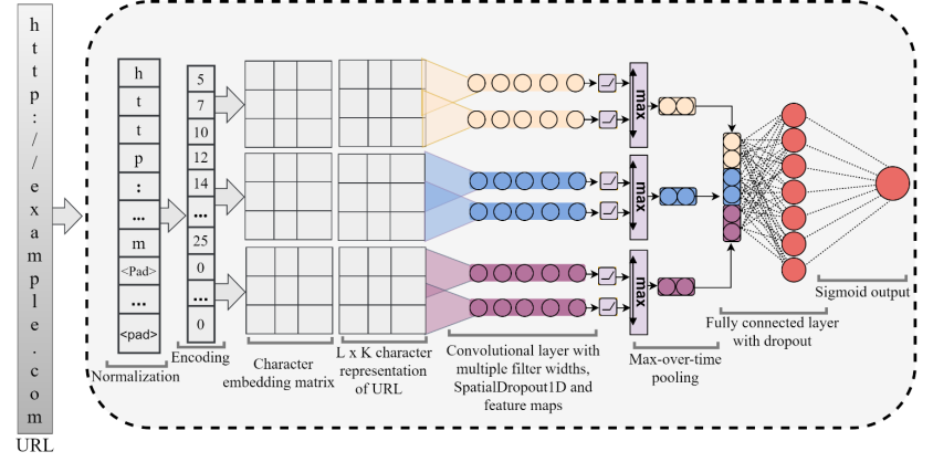 过去,网络钓鱼的检测依赖于黑名单,但黑名单并不全面,也缺乏对新生成恶意URL地址的检测能力。最近,机器学习被广泛用于检测恶意网址的攻击,其中最常见的方法是通过提取URL地址的词汇属性来分析各种特征,然后采用支持向量机、梯度提升和随机森林等机器学习模型去预防攻击。但这些方法存在缺陷,无法记录语义或顺序模式,也需要人工提取URL特征,增加了计算和操作的开销,而且无法在训练期间处理未见过的特征并泛化到测试数据。